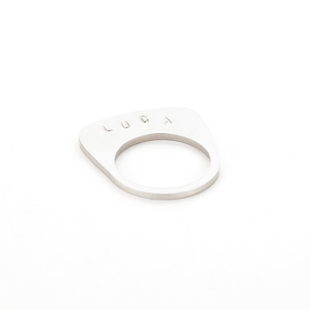 Drie vormen. Eindeloze combinaties. Elke ring draagt een letter, gestempeld met zorg – een blijvende indruk, letterlijk. Zet ze samen en de ring wordt een spel van lijnen en lagen, van liefde en leven. Geboorte. Verlies. Groei. Jij bouwt. Jij bepaalt.